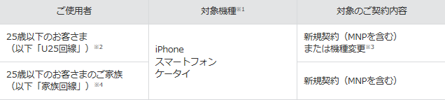 対象者:のりかえ(MNP)の場合は年齢制限無し、新規契約の場合はU22(5~22歳)のみ
