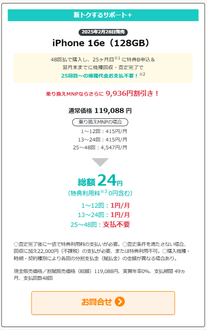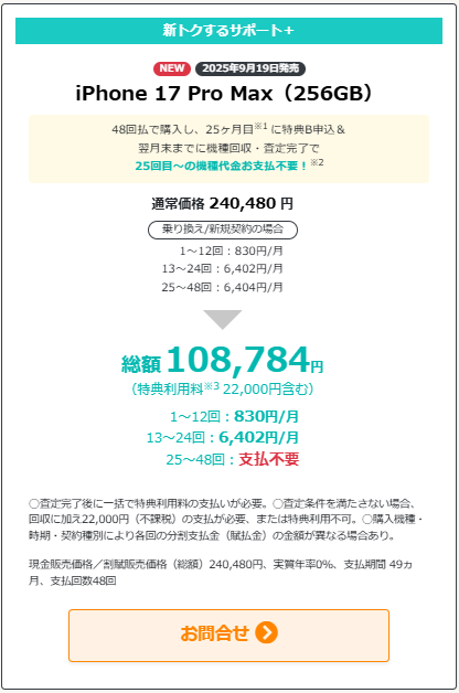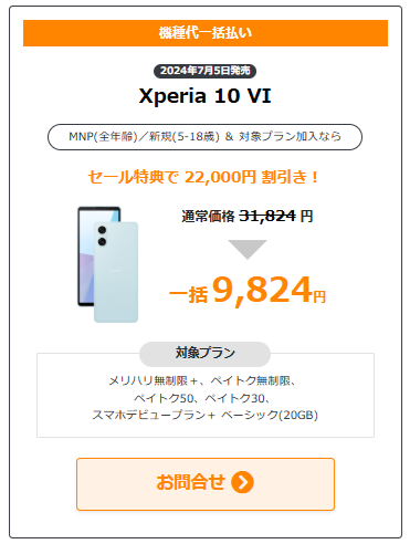 - キャッシュバック額→現金キャッシュバックの場合:2万円 機種代金からの割引の場合:22,000円割引